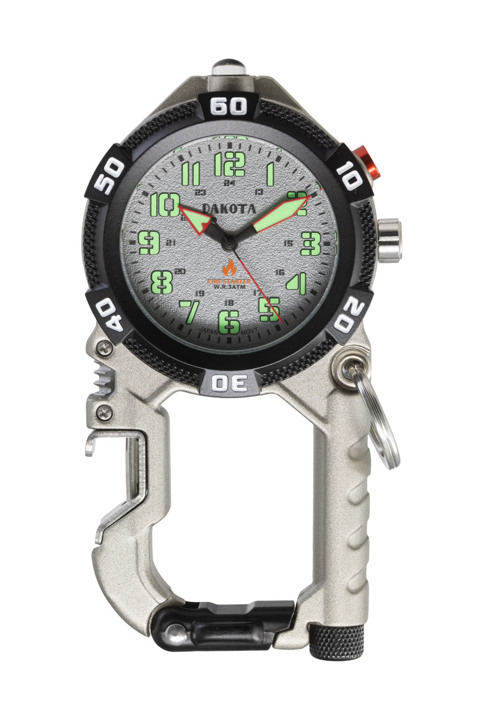 The Dakota Flint Clip isn't just a watch; it's a command center for your keychain. By combining four essential tools into one streamlined device, it ensures you’re always prepared without weighing you down. The integrated carabiner clips instantly to your gear, putting reliable timekeeping and indispensable utilities right at your fingertips.